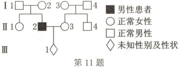 (2)据图可知,图中4号是男性患者,基因型是XᵇY;由于10号为男性患者,基因型为XᵇY,他的父母正常,则5号个体的基因型是XᴮY,6号的基因型是XᴮXᵇ,11号的基因型是XᴮXᴮ或XᴮXᵇ。