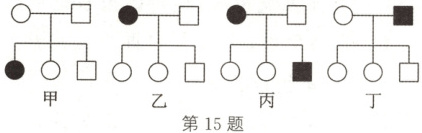 15. 如图是四个遗传病家族的系谱图,图中“□、○”分别表示正常男女,“■、●”分别表示患病男女。请据图回答下列问题: