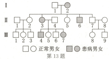 13.D 解析:抗维生素D佝偻病属于伴X染色体显性遗传病,伴X染色体显性遗传病在人群中女性发病率高于男性,A错误;图中Ⅱ-3和Ⅲ-7两个女患者的致病基因来自其母亲,但不能确定Ⅰ-2的致病基因来自其母亲还是父亲,B错误;由于抗维生素D佝偻病属于显性遗传病,因此图中正常个体均不携带该遗传病的致病基因,C错误;Ⅲ-8与患该遗传病的男性结婚,则正常情况下后代女孩都患病,男孩都正常,所以应建议他们生育男孩,D正确。