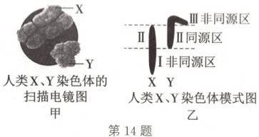 14.(2024·河北唐山期中)图甲为人类性染色体的扫描电镜图,图乙为人类性染色体的模式图。结合两图分析,下列叙述正确的是 (