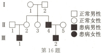 16.C 解析:图中Ⅰ-1和Ⅰ-2都正常,生出的Ⅱ-4患病,说明该病为隐性遗传病,但无法判断是常染色体隐性遗传还是伴X染色体隐性遗传,因此无法判断夜盲症类型,A错误;进行性夜盲症是常染色体隐性遗传病,男女患病概率相同,B错误;该病为隐性遗传病,若Ⅰ-2不携带致病基因,则该病是静止性夜盲症(伴X染色体隐性遗传病),Ⅱ-1和Ⅱ-2的基因型分别为XᴬY和XᴬXᵃ,所以Ⅱ-1和Ⅱ-2再生一个患病男孩的概率是1/4,C正确;若Ⅰ-2携带致病基因,则该病是进行性夜盲症(常染色体隐性遗传病),Ⅲ-1(dd)的致病基因来自双亲Ⅱ-1和Ⅱ-2,Ⅱ-2的致病基因来自Ⅰ-1或者Ⅰ-2,因此Ⅰ-2的致病基因不一定会遗传给Ⅲ-1,D错误。