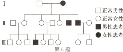 6.C 解析:血友病是伴X染色体隐性遗传病,其特点是隔代交叉遗传;男患者多于女患者;女性患者的父亲和儿子都是患者,男性正常个体的母亲和女儿都正常,最能反映该病遗传特点的是Ⅰ代女性患者的儿子都患血友病。