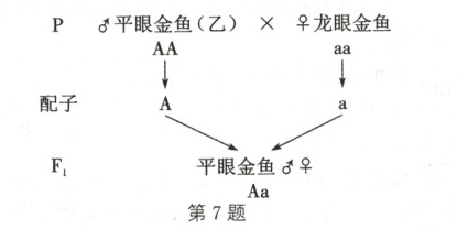 (4)纯合子 实验三:♀平眼金鱼(甲)×♂龙眼金鱼(丁)→F₁平眼金鱼:龙眼金鱼≈1:1,说明甲平眼金鱼的遗传因子组成为Aa;在实验一中,甲(Aa)与乙平眼金鱼杂交,F₁全为平眼金鱼,说明乙平眼金鱼的遗传因子组成为AA,即纯合子。如图所示