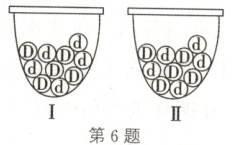 6.C 解析:两个小桶可分别代表雌、雄生殖器官,两个小桶内的小球可分别代雌、雄配子,A错误;本实验模拟分离定律,亲本遗传因子组成为Dd,产生的配子种类及比例为D:d=1:1,因此每个小桶中的两种小球数量需要相等,两个小桶内的小球数量可以不等,B错误;I小桶中丢失一个D球和一个d球后,小桶内的D球和d球数量相等,抓取D球或d球的概率不变,不影响实验结果,C正确;两个小桶中均丢失一个D球,每个小桶中抓取D球和d球的概率不相同,不能继续进行实验,D错误。