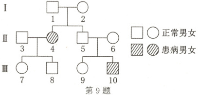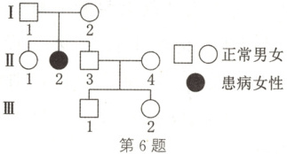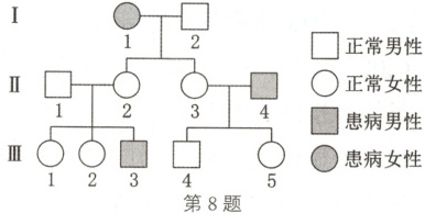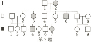 7.D 解析:分析题意可得,该病为伴性遗传,可能是显性或隐性遗传,假设是伴 X 染色体隐性遗传病,用 B、b 表示相关基因,则Ⅰ-1 的基因型为$X^BY$,其女儿Ⅱ₃的基因型为$X^BX^b$,表现正常,和图中不符合,因此该病为伴 X 染色体显性遗传病,I-2 的基因型为$X^BX^b$,父亲不一定患此病,A 正确;该病为伴 X 染色体显性遗传病,Ⅱ-5 和Ⅱ-7 都正常,不含有致病基因,B 正确;该病为伴 X 染色体显性遗传病,可能为抗维生素 D 佝偻病,C 正确;分析可知Ⅲ-7 的基因型为$X^BX^b$,与正常男性$(X^bY)$婚配,生男孩患病$(X^BY)$的概率为 1/2,生女孩患病$(X^BX^b)$的概率也为 1/2,D 错误。