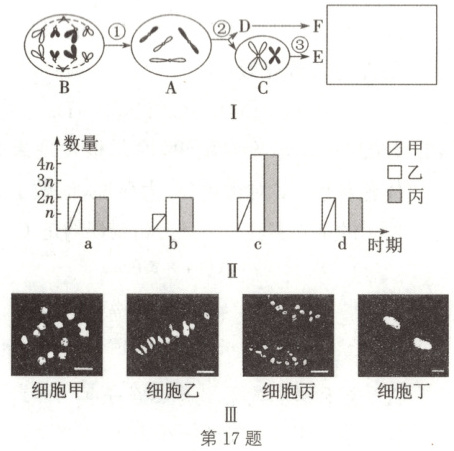 17.(2025·江苏泰州期中)图Ⅰ是某雌性小鼠体内细胞的分裂示意图($2n = 40$,仅显示部分染色体),图Ⅱ是该小鼠减数分裂过程中染色体、核DNA、染色单体数量的变化,图Ⅲ为减数分裂过程中不同时期的显微照片。