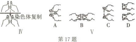 (5)①正常情况下,图IV中右手的中指和食指代表的是两条相同的姐妹染色单体,因此含有相同的遗传物质,即含有相同的基因;同一条染色体上含有多个非等位基因,A正确,B、C、D错误。②减数第一次分裂前期(四分体时期)可能发生非姐妹染色单体的互换,图V中双手食指代表一对同源染色体,A表示复制后的染色体散乱排列在细胞中,处于减数第一次分裂前期,因此图V中可能发生染色体互换的是A。基因的分离和自由组合发生在减数第一次分裂后期,此时同源染色体分离,非同源染色体自由组合,故能体现分离定律和自由组合定律实质的是C。