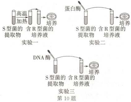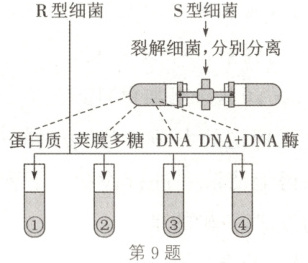 9. D 解析:在图示肺炎链球菌体外转化实验中,设置了④DNA+DNA酶的一组起对照作用,实验结果是用DNA酶水解S型细菌的DNA没有发生转化,说明起转化作用的是DNA,A正确;因为①②③④培养基中均加入R型活细菌,所以①②③④培养基中都能分离出R型细菌,B正确;③中加入了S型细菌的DNA,其他试管没有S型细菌的DNA(④中S型细菌的DNA被DNA酶催化水解了),所以只有③培养基中能转化出S型细菌,C正确;通过实验,只有S型细菌的DNA能够使R型细菌转化为S型细菌,所以实验证明DNA是肺炎链球菌的遗传物质,蛋白质不是,D错误。
