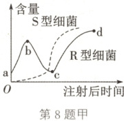 (1) 在格里菲思所做的肺炎链球菌转化实验中,将无毒性的 R 型活细菌与被加热杀死的 S 型细菌混合后注射到小鼠体内,从小鼠体内分离出了有毒性的 S 型活细菌。图甲是将加热杀死的 S 型细菌与 R 型活细菌混合注射到小鼠体内后两种细菌的含量变化。请回答下列问题: