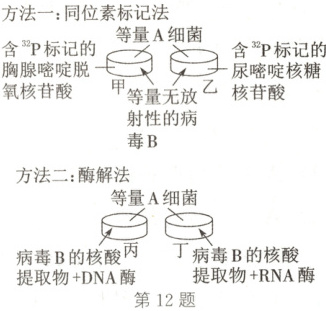 12. (选做题)(2025·安徽六安期末)科研人员利用一种感染 A 细菌的病毒 B 采用下图所示的两种方法来探究病毒 B 的遗传物质是$ DNA$ 还是$ RNA$。下列相关叙述正确的是 (