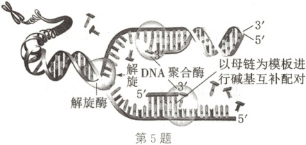 5.B 解析:DNA复制时引物与模板的3'端结合,子链的延伸方向是5'端→3'端,A正确;DNA的复制特点是边解旋边复制,解旋酶能使DNA螺旋的双链打开,B错误;C—G碱基对含有氢键的数量较多,若DNA中含C—G碱基对比例高,则解旋时会消耗更多能量,C正确;DNA半保留复制方式能够精确地指导子代DNA的合成,因此能保持亲代与子代之间遗传信息的连续性,D正确。