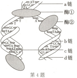 4.D 解析:酶①为解旋酶,可作用于氢键,而酶②为DNA聚合酶,不能作用于氢键,A错误;由图可知,该过程的模板链是a、b链,B错误;图示为DNA复制过程,该过程发生在有丝分裂前的间期和减数第一次分裂前的间期,C错误;DNA复制的特点有半保留复制(子代DNA包含了亲代DNA的一条链)和边解旋边复制,D正确。