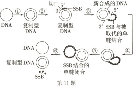 11.C 解析:M13噬菌体DNA是单链环状的,环状DNA分子不含游离的磷酸基团,不含有核糖,含有脱氧核糖,A正确;SSB是单链DNA结合蛋白,由图可知SSB的作用是防止解开的两条单链重新形成双链,利于DNA复制,B正确;据题图和题意可知,M13噬菌体DNA是一种单链环状DNA,进入大肠杆菌后先合成为复制型双链DNA,再进行滚环复制,滚环复制后可形成一个单链环状DNA和一个复制型DNA,新合成的DNA为复制型DNA中的一条链,C错误;M13噬菌体的DNA为含有6407个核苷酸的单链环状DNA,没有进行碱基互补配对,所以M13噬菌体DNA的碱基中嘌呤数和嘧啶数不一定相等,D正确。