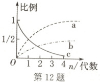 12. (多选)将遗传因子组成为$Aa$的豌豆连续自交,后代中纯合子和杂合子所占的比例如图曲线所示,据此分析,下列说法正确的是(