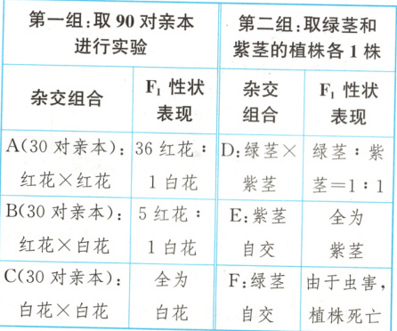 (3)B组中,30对红花×白花,F₁中红花:白花=5:1,说明亲本红花植株的遗传因子有纯合子和杂合子两种,亲本杂合子红花×白花,子代比例为红花:白花=1:1,占2份,由于总的子代红花:白花=5:1,共6份,故亲本纯合子红花×白花占4份,故亲本红花种群中纯合子:杂合子=4:2=2:1。