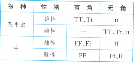 14. (选做题)某甲虫的有角和无角受一对遗传因子$T$、$t$控制;牛的有角和无角受一对遗传因子$F$、$f$控制,如表所示。下列相关叙述正确的是(