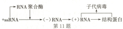 11. B 解析:病毒增殖过程中,模板是由病毒自身提供的,而原料、酶、能量等条件由宿主细胞提供,A错误。XBB毒株是RNA病毒,其遗传信息传递途径为RNA的复制以及RNA→蛋白质;细菌是细胞生物,遗传信息传递途径包括DNA的复制、转录和翻译等,二者遗传信息传递途径不同,但均存在RNA→蛋白质的过程,B正确。+ssRNA一段序列M中共含碱基2000个,其中G和C占碱基总数的35%,以+ssRNA为模板合成一条子代(+)RNA的过程实际需要RNA链复制两次,即相当于合成一个双链RNA,且这两条RNA链为互补关系,因此,共需要A和U的量为(1-35%)×2000×2=2600(个),C错误。RNA聚合酶是在宿主细胞内发挥作用,催化RNA的合成,病毒没有细胞结构,不能独立进行生命活动,RNA复制发生在宿主细胞内,而不是病毒体内,D错误。