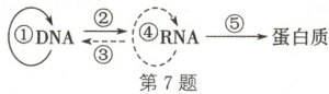 7. C 解析:过程①是DNA的复制,一切遗传物质为DNA的生物都能进行DNA复制,如细胞生物和DNA病毒,因此能完成过程①的生物不一定都有细胞核,A正确;图中过程①~⑤都需要遵循碱基互补配对原则,B正确;过程③是所有逆转录病毒都要进行的过程,但不是所有RNA病毒都能完成该过程,如RNA复制病毒不进行逆转录,C错误;真核生物和原核生物都能进行细胞分裂和蛋白质合成,故真核生物和原核生物体内都能完成过程①DNA复制、②转录、⑤翻译,D正确。