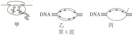 5. C 解析:双链 DNA 中,两条链的 G 和 C 之间可形成三个氢键,A 和 T 之间可形成两个氢键,高温解旋时,双链 DNA 中 G 占比越高,DNA 变性所需温度越高,A 正确;DNA 复制时,子链延伸的方向是 5'→3',即在 DNA 聚合酶的催化下游离的脱氧核苷酸添加到子链 3'端,B 正确;转录时在能量的驱动下,RNA 聚合酶将 DNA 两条链之间的氢键断裂,C 错误;DNA 两条链之间的碱基遵循互补配对原则,若一条链中 G+C 占该链的 30%,则另一条链中 A+T 占该链的 70%,D 正确。