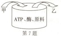 7. A 解析:由题干信息可知,该过程发生在某生物体内,病毒没有细胞结构,不能独立进行代谢,所以该生物可能是被逆转录的 RNA 病毒寄生的生物,A 错误;若甲是 DNA,乙是 RNA,则该过程是转录,根尖分生区细胞在分裂间期会进行旺盛的转录,以合成蛋白质等,B 正确;若甲是 DNA,乙是 DNA,则该过程是 DNA 复制,胚胎干细胞具有较强的分裂能力,会进行 DNA 复制,C 正确;若甲是 RNA,乙是蛋白质,则该过程是翻译,叶绿体中含有少量 DNA,能转录形成 RNA,RNA 可以在叶绿体内进行翻译合成蛋白质,D 正确。