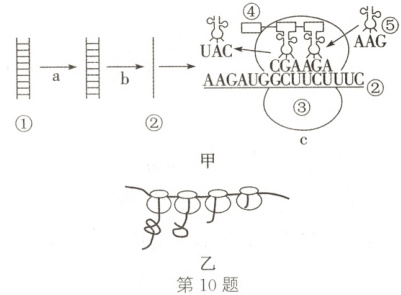 10. (2024·四川成都期末)如图甲是遗传信息的传递过程,①~⑤ 表示物质或结构,$a$、$b$、$c$ 表示生理过程,图乙表示 $c$ 过程中的一种现象。据图回答下列问题(可能用到的密码子:AUG—甲硫氨酸、GCU—丙氨酸、UCU—丝氨酸、UUC—苯丙氨酸、AGA—精氨酸、AAG—赖氨酸)。