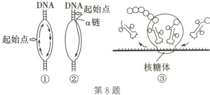 8. C 解析:DNA 聚合酶参与 DNA 复制过程,RNA 聚合酶参与转录过程,它们都以 DNA 为模板,因此 DNA 聚合酶和 RNA 聚合酶的结合位点都在 DNA 上,A 错误;转录的产物是 RNA,RNA 包括 mRNA、tRNA、rRNA 等,因此在细胞中②过程转录出的 α 链也可能是 tRNA 或 rRNA,B 错误;②过程(转录)碱基配对方式有 A—U、T—A、C—G、G—C,①过程(DNA 的复制)碱基配对方式有 A—T、T—A、C—G、G—C,因此与①过程相比,②过程特有的碱基配对方式为 A—U,C 正确;①表示 DNA 的复制,②表示转录,③表示翻译,人体神经细胞是高度分化的细胞,不能进行细胞分裂,不能进行①过程,但可以进行②转录和③翻译,D 错误。