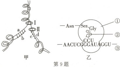 9. (2025·四川眉山期末)图甲中 $DNA$ 分子有 $a$ 和 $d$ 两条链,Ⅰ 和 Ⅱ 均是 $DNA$ 分子复制过程中所需要的酶,图乙表示细胞内合成酶 Ⅱ 的一个阶段。据图回答下列问题: