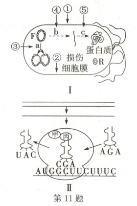 11. (2025·辽宁沈阳期中)医学上常使用抗生素治疗由细菌引起的疾病。图Ⅰ中①~⑤分别表示不同抗生素抑制细菌的作用机制,其中②表示抗生素通过损伤细胞膜从而达到抑菌的作用;字母 $a$、$b$、$c$ 表示遗传信息的传递过程,$F$、$R$ 表示不同的结构。图Ⅱ表示该细菌细胞中某基因的表达过程(注:甲、丙分别表示甲硫氨酸、丙氨酸)。请回答下列问题: