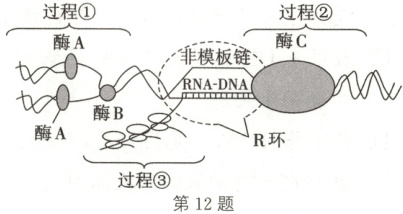 12. (2024·福建泉州期中)科学家研究发现,某种生物的细胞中遗传信息传递的部分过程如图所示。当某些基因转录形成的 $mRNA$ 分子难以与模板链分离时,会形成 $RNA-DNA$ 杂交体,这时非模板链、$RNA-DNA$ 杂交体会共同构成 $R$ 环结构。进一步研究表明,$R$ 环结构会影响 $DNA$ 复制、转录和基因的稳定性等。回答下列问题: