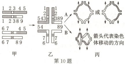 10.C 解析:图中细胞减数分裂过程中染色体的某些片段发生了易位,染色体没有缺失,A错误;发生易位的染色体,其相关基因的位置发生了改变,基因的数量不改变,B错误;图乙所示时期细胞中的染色体发生了联会,处于减数第一次分裂前期,此时细胞中有16条染色单体,C正确;按B方式产生的精子含有的染色体没有发生缺失和重复,则都不致死,D错误。