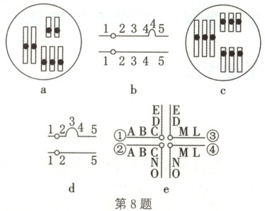 8.AD 解析:由图可知,a图中某一对同源染色体多出一条染色体,即个别染色体的增加,A正确;b图中,一条染色体上增加了4个DNA片段,将导致染色体上的基因数目的增多,种类未增加,B错误;c图含有三个染色体组,但如果是由配子发育而来的则为单倍体,也有可能是六倍体生物配子中的染色体组成,不一定是三倍体生物体细胞的染色体组成,C错误;e图染色体某一片段移接到另一非同源染色体上,属于易位,D正确。
