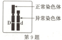9.D 解析:据图可知,与正常染色体相比,异常染色体短一段,说明发生了染色体结构变异中的缺失,但染色体数目不变,A错误;图示变异属于染色体结构变异,为可遗传变异,可为生物进化提供原材料,B错误;图示两条染色体为一对同源染色体,减数分裂时同源染色体应分离,因此图中两条染色体不能出现在同一配子中,C错误;植株甲自交后代基因型为DD、Dd、dd,已知至少含一条正常的该染色体的农作物才能存活,因此dd的个体不能存活,即后代均为高产性状,D正确。