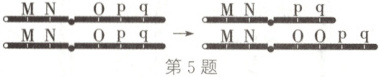 5.C 解析:据图分析,图中的变异是下面一条染色体发生了O基因数目的增加,属于重复,而上面一条染色体是少了O基因,染色体基因数目减少,属于缺失,属于染色体结构变异。