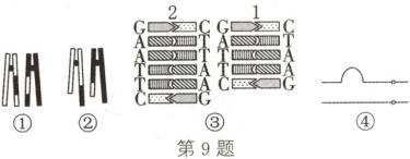 9.D 解析:图①表示互换,发生在减数分裂的四分体时期,图②表示易位,发生在有丝分裂和减数分裂的任何时期,A错误。图③中的变异属于基因突变中的碱基对的增添,不会使基因所在的染色体发生结构变异,B错误。图④中,若上面的染色体正常,则下面染色体发生染色体结构变异中的缺失;若下面染色体正常,则上面染色体发生染色体结构变异中的重复,C错误。①属于基因重组,②④属于染色体变异,③属于基因突变,它们均属于可遗传变异,D正确。