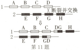 11.A 解析:1、2两条染色体相应位置上的基因种类不同,即图示交换发生在非同源染色体上,可借助光学显微镜进行观察,A正确;1、2两条染色体相应位置上的基因种类不同,因此1和2两条染色体属于非同源染色体,即图示交换发生在非同源染色体上,属于染色体结构变异中的易位,B错误;人类猫叫综合征的形成原因与5号染色体部分缺失有关,与图示变异类型不同,C错误;据图可知,图中的变异引起了基因排列顺序的变化,D错误。