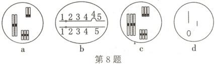 8.D 解析:a细胞中多了一条染色体,为三体,但不知该细胞所在个体的发育起点是配子还是受精卵,因此无法判断该细胞所在个体是二倍体还是单倍体,A错误;b细胞中一条染色体上4所在染色体片段重复,属于染色体结构变异,B错误;21三体综合征患者体内21号染色体有三条,是细胞内个别染色体的增加,图c细胞中含有三个染色体组,是以染色体组为单位的染色体数目变异,C错误;d细胞中只有1个染色体组,是单倍体,因减数分裂过程中联会紊乱而高度不育,与正常植株相比,单倍体植株长得弱小,D正确。
