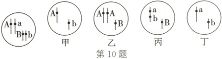 10.(2024·江苏泰州期末)(多选)如图甲~丁表示某雄性个体(基因型为AaBb,基因所在的位置如图所示)产生的4个精细胞中染色体以及基因的分布情况,图中字母表示相关基因。下列相关叙述错误的是 (