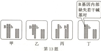 13.(2024·辽宁名校联盟期末)某雌雄同株植物的宽叶和窄叶为一对相对性状,宽叶对窄叶为显性,受一对等位基因B、b控制。对基因型为Bb的杂合植株(部分染色体及基因位置如图甲)进行诱变处理,得到图乙、丙、丁所示的突变体,据图回答问题:
