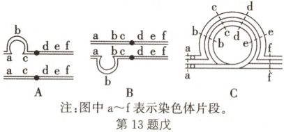 (2)上述诱变处理也有可能引起染色体某一片段位置颠倒,颠倒片段的长度会影响减数分裂过程中同源染色体的联会,图戊所示变异属于该种类型(倒位)的是