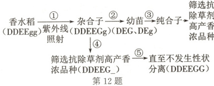 12.(2025·安徽蚌埠质量检测)香水稻具有香味浓郁(DD)、高产(EE)等优良性状,但是不抗除草剂(gg),三种性状独立遗传,为培育香味浓郁、高产、抗除草剂(DDEEGG)的优良品种,研究者设计了如下流程。下列叙述正确的是 (