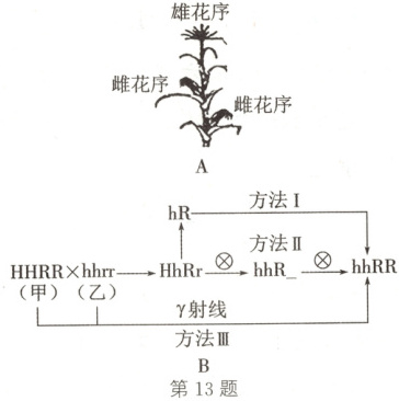 13.(2024·江苏镇江期末)玉米(2N=20)是世界上重要的粮食作物之一,也是遗传学研究中常用的模式生物。图A为玉米植株示意图。玉米的高秆(H)对矮秆(h)为显性,抗病(R)对易感病(r)为显性,两对基因分别位于两对同源染色体上。图B表示利用品种甲(HHRR)和乙(hhrr)通过三种育种方法(Ⅰ~Ⅲ)培育纯合优良品种矮秆抗病(hhRR)的过程。回答下列问题: