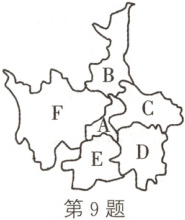 9. (2024·重庆段考)如图,用若干种颜色去涂 A,B,C,D,E,F 这 6 个区域,使得相邻区域的颜色不同,则最少需要