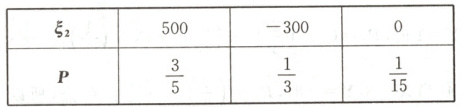 (2) 选择项目一.理由:$E(\xi_1)=400×\frac{3}{5}+(-100)×\frac{2}{5}=200,E(\xi_2)=500×\frac{3}{5}+(-300)×\frac{1}{3}+0×\frac{1}{15}=200,$$D(\xi_1)=(400-200)^2×\frac{3}{5}+(-100-200)^2×\frac{2}{5}=60000,D(\xi_2)=(500-200)^2×\frac{3}{5}+(-300-200)^2×\frac{1}{3}+(0-200)^2×\frac{1}{15}=140000.$因为$E(\xi_1)=E(\xi_2),$$D(\xi_1)<D(\xi_2),$所以说明项目一、项目二投资收益的期望值相等,而项目一的投资收益更稳定.综上所述,选择项目一更合理.
