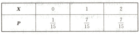 所以$E(X)=0×\frac{1}{15}+1×\frac{7}{15}+2×\frac{7}{15}=\frac{7}{5}。$