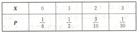 所以$E(X)=0×\frac{1}{6}+1×\frac{1}{2}+2×\frac{3}{10}+3×\frac{1}{30}=\frac{6}{5}。$