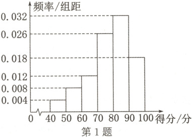 1. (2025·齐齐哈尔期中)为调查居民对两会相关知识的了解情况,某小区开展了两会知识问答活动,现将该小区参与该活动的 800 名居民的得分(满分 100 分)进行了统计,得到如图所示的频率分布直方图.