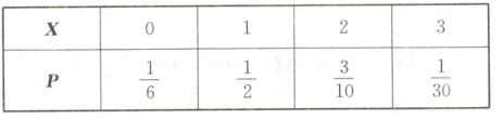 所以$E(X)=0×\frac{1}{6}+1×\frac{1}{2}+2×\frac{3}{10}+3×\frac{1}{30}=\frac{6}{5}$.