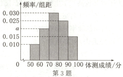 3. 某校为了解高一年级学生的体育健康标准测试(简称“体测”)成绩的分布情况,从该年级学生的体测成绩(满分为100分)中,随机抽取了80名学生的成绩数据,并进行分组:[50,60),[60,70),[70,80),[80,90),[90,100],绘制成如图所示的频率分布直方图,则该校高一年级学生体测成绩数据的第80百分位数的估计值是(