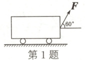 1. 如图,一力 $ \boldsymbol{F} $ 作用在小车上,且力 $ \boldsymbol{F} $ 的大小为 $ 10 \, N $,方向与水平面成 $ 60^{\circ} $ 角,则当小车向前运动 $ 10 \, m $ 时,力 $ \boldsymbol{F} $ 所做的功为(