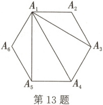 13. 如图,六边形 $ A_1A_2A_3A_4A_5A_6 $ 是一个正六边形,连接 $ A_1A_3 $,$ A_1A_4 $,$ A_1A_5 $。将下列向量的数量积按从小到大的顺序排列:$ \overrightarrow{A_1A_2} · \overrightarrow{A_1A_3} $,$ \overrightarrow{A_1A_2} · \overrightarrow{A_1A_4} $,$ \overrightarrow{A_1A_2} · \overrightarrow{A_1A_5} $,$ \overrightarrow{A_1A_2} · \overrightarrow{A_1A_6} $。